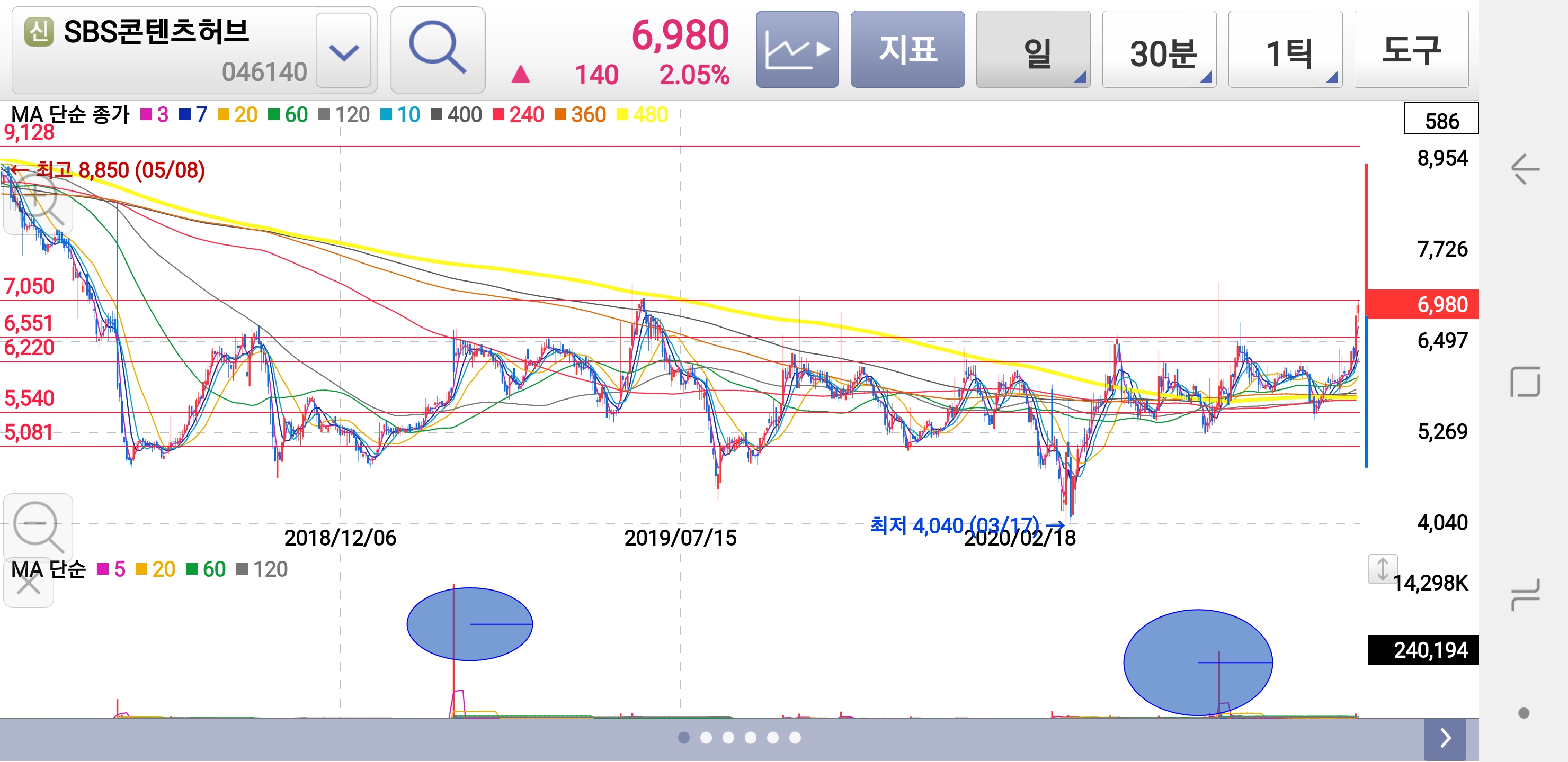 오늘 의미있는 박스상단인 7천원을 돌파하여